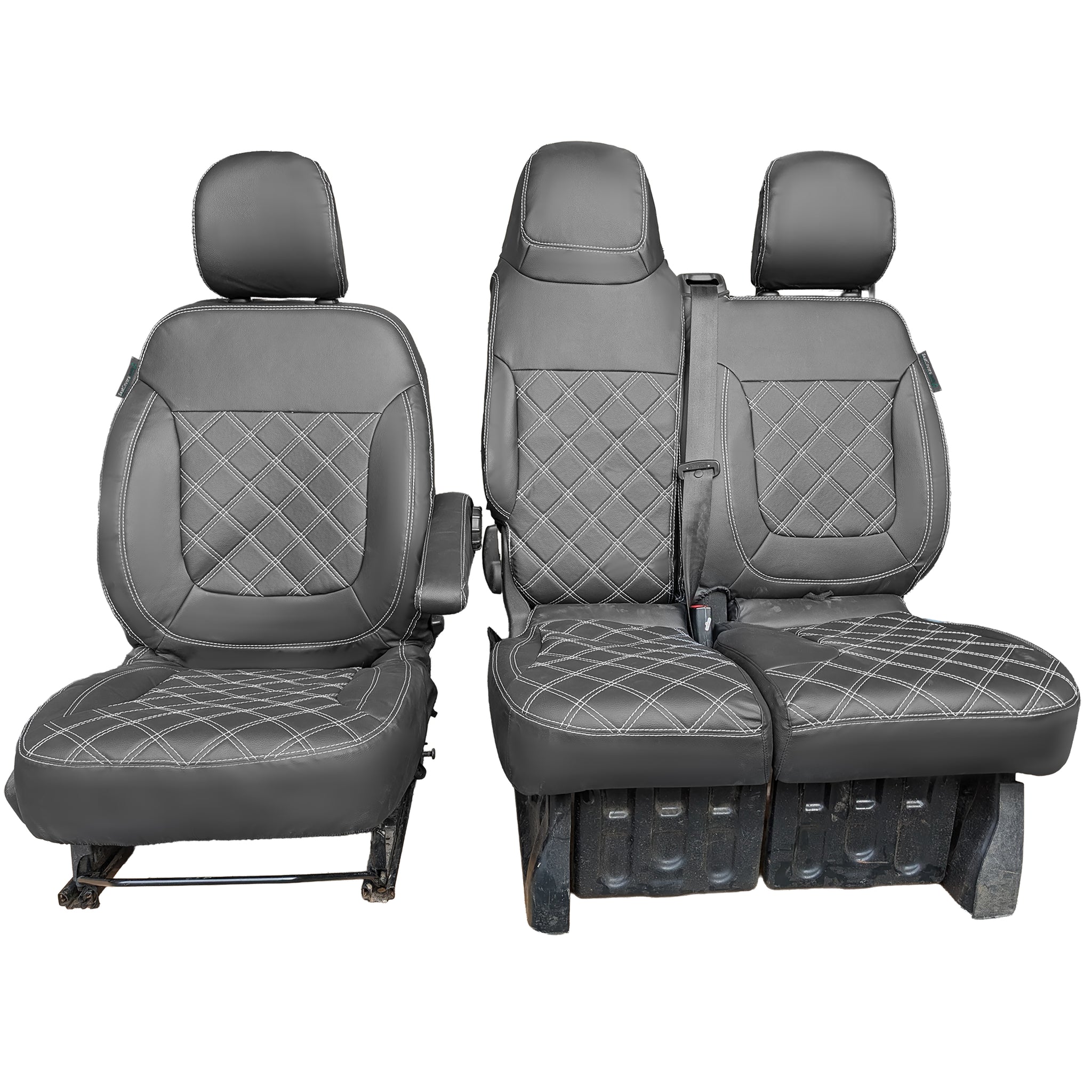 Front seats single and twin, folding middle seat and split passenger seat base, specialised stitch for seat mounted airbags, factory built no conversions.